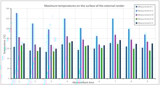 Graph of the maximum temperatures on the surface of the external render for the nine tested areas across five consecutive measurements.