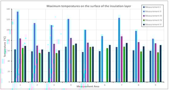 Graph of the maximum temperatures on the surface of the insulation layer for the nine tested areas across five consecutive measurements.