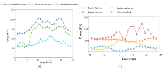 The input data arrays for electricity, heating, cooling, and gas loads, as well as renewable energy generation (wind and photovoltaic), are synthetically generated based on real-world statistical patterns and sectoral load archetypes. Specifically, the electricity and thermal load profiles for the three IES regions are derived from typical urban residential, suburban renewable-rich, and industrial zone consumption data published in the China Energy Statistical Yearbook and regional energy usage reports. The renewable generation profiles are generated using historical meteorological data (e.g., solar irradiance and wind speed) obtained from the China Meteorological Administration and processed through established power conversion models.
