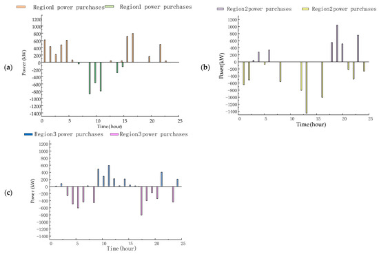 Under the guidance of the proposed game-theoretic interaction strategy, the MRIES operates in a coordinated manner, addressing the issue of spatial resource complementarity across regions through electricity trading among individual IESs and between the IESs and the upper-level IESO. IES2 and IES3 serve as electricity-surplus regions. During periods of power shortage in IES1, surplus electricity from IES2 and IES3 is transferred to IES1, thereby ensuring its stable operation. The inter-regional electricity exchange results among the integrated energy systems are illustrated in