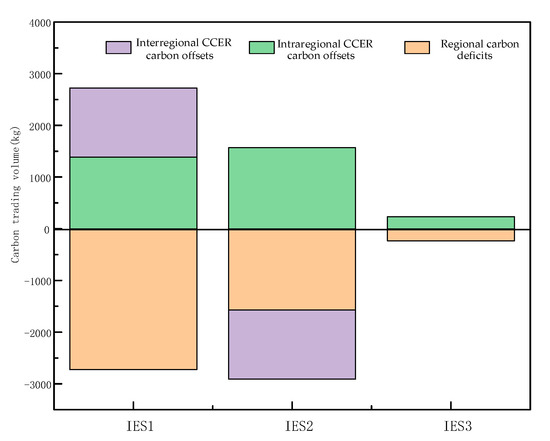 Due to the deployment of gas-fired generation units, IES1 emitted 6741.9 kg of carbon, resulting in a shortfall of 2725.8 kg beyond its allocated carbon quota. To minimize carbon trading costs, 13.21 green certificates were utilized to offset 1385.65 kg of emissions via the CCER mechanism. The remaining deficit was covered by procuring additional green certificates from IES2. Benefiting from a high level of renewable energy utilization, IES2 initially held 21.75 green certificates. After the transaction, it retained 7.93 certificates and earned RMB 634.4 through market-based trading. IES3, relying on a renewable-based power supply system, maintained a low carbon footprint and traded 6.35 surplus certificates, generating RMB 508 in revenue. Through inter-regional certificate exchange, all three IESs effectively achieved carbon quota balancing while significantly reducing emission reduction costs.