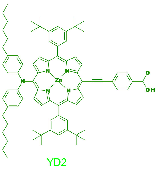 The YD2-only dye anchors to the TiO2 surface through ester linkages formed between its carboxyl functional groups and surface hydroxyls on the TiO2 nanoparticles [25,26]. This molecular interaction facilitates efficient electron transfer from YD2-only to the conduction band of TiO2, resulting in a photovoltaic conversion efficiency of approximately 1.24% in DSSCs, utilizing YD2-only as the primary sensitizer.