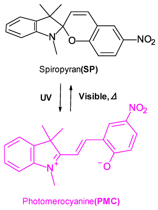 Reversible photoinduced isomerization of SPNO2 between the closed spiropyran (SP) and open photomerocyanine (PMC) forms under UV and visible light irradiation.