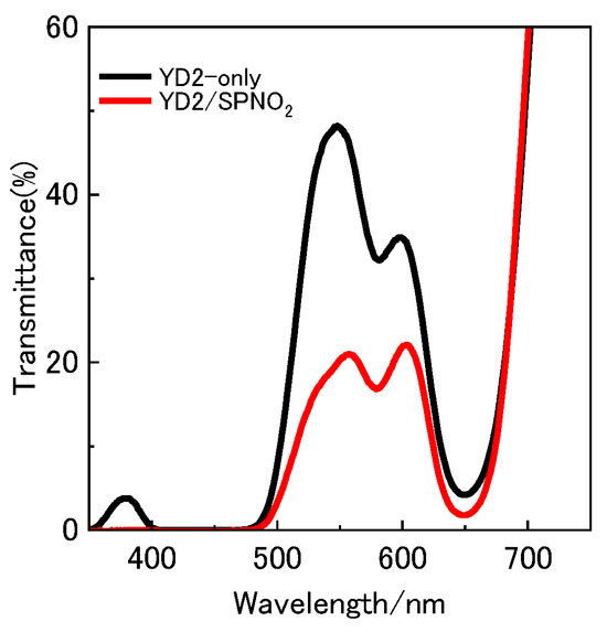 Ultraviolet–visible (UV–Vis) transmittance spectra of TiO2-based photoelectrodes sensitized with YD2-only (black curve) and co-sensitized with YD2 and SPNO2 (red curve). The spectra highlight the reduced transmittance in the visible region (500–650 nm) due to SPNO2 adsorption, particularly in its photoinduced PMC form.