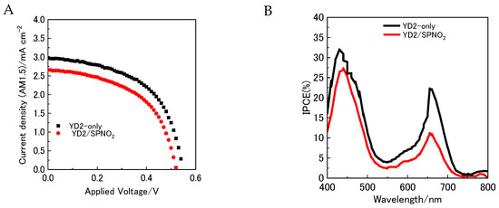 The current–voltage (J–V) characteristics of DSSCs incorporating YD2-only alone and co-sensitized with YD2/SPNO2 were measured under AM1.5 illumination, as shown by the black and red curves in Figure 4A. The data confirm that electron injection from YD2-only into the conduction band of TiO2 nanoparticles was effectively promoted via its photosensitization. The energy conversion efficiencies (η) for the devices containing only YD2-only and those co-sensitized with YD2/SPNO2 were found to be 1.24% and 0.71%, respectively. This decrease in efficiency is likely due to the reduced light absorption by YD2-only, which may be caused by surface adsorption of SPNO2 (both SP and PMC forms) on the electrode.