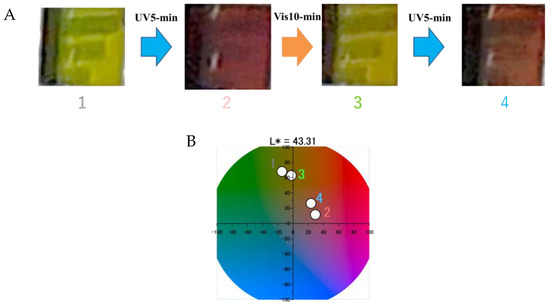 Photographs showing the photoisomerization behavior of the YD2/SPNO2-sensitized TiO2 electrode under alternating ultraviolet (UV) and visible (Vis) light irradiation. (A) Sequential images labeled 1–4: (1) natural state; (2) after 5 min UV irradiation; (3) after 5 min UV followed by 10 min Vis irradiation; (4) after 5 min UV + 10 min Vis + additional 5 min UV irradiation. (B) Corresponding CIE Lab chromaticity diagram indicating the color changes induced by the isomerization of SPNO2 on the TiO2 surface, with numbers 1–4 matching the conditions shown in (A).