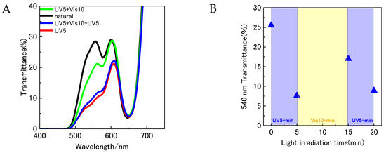 (A) UV–Vis transmittance spectra of YD2/SPNO2-sensitized TiO2 photoelectrodes under sequential light irradiation conditions: natural light (black line), UV irradiation for 5 min (red line), UV for 5 min followed by visible light for 10 min (green line), and UV for 5 min + Vis for 10 min + UV for 5 min (blue line). (B) Evolution of transmittance intensity at 540 nm (red circles) corresponding to the first irradiation (UV, 5 min), second irradiation (Vis, 10 min), and third irradiation (UV, 5 min), highlighting the reversible modulation behavior.