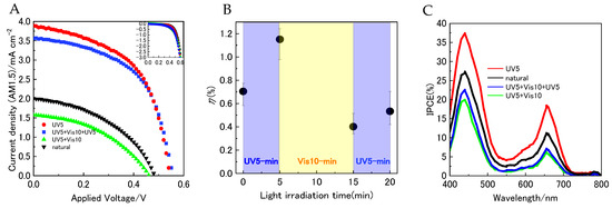 (A) Current density–voltage (J–V) characteristics of YD2/SPNO2-based dye-sensitized solar cells (DSSCs) measured under AM1.5 illumination (100 mW cm−2), with external ultraviolet (UV) and visible (Vis) light irradiation. The inset displays the dark current density behavior of the same devices. (B) Power conversion efficiency (η) of YD2/SPNO2-based DSSCs under alternating UV and Vis irradiation cycles, illustrating reversible photovoltaic modulation. (C) Incident photon-to-current efficiency (IPCE) spectra of YD2/SPNO2-based DSSCs recorded under 400–800 nm monochromatic illumination with external UV and Vis light exposure.