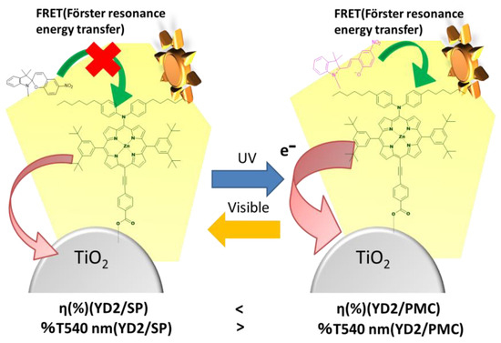 Schematic illustration of the proposed mechanism underlying the photovoltaic behavior of YD2/SPNO2-based dye-sensitized solar cells (DSSCs). The diagram highlights the role of photoinduced isomerization of SPNO2 and the subsequent Förster resonance energy transfer (FRET) from the photomerocyanine (PMC) form to the YD2 dye, contributing to enhanced light absorption and charge generation under ultraviolet (UV) irradiation.