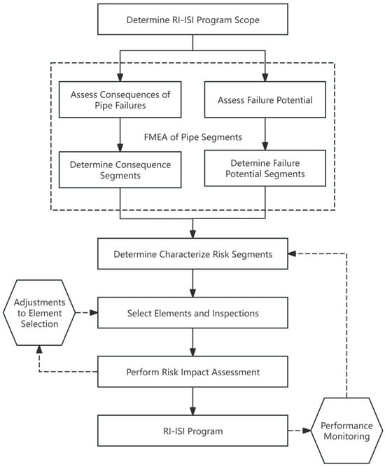 This study adopted the EPRI TR-112657 [6] RI-ISI framework (Figure 1), integrating deterministic specifications with PSA. It optimized pipeline ISI strategies through steps including defining the analysis scope, conducting failure mode and effect analysis (FMEA) of pipe segments, characterizing risk segments, selecting elements and inspections, performing risk impact assessment, making adjustments to element selection and performance monitoring, and ensuring resources focused on areas with relatively high risks.