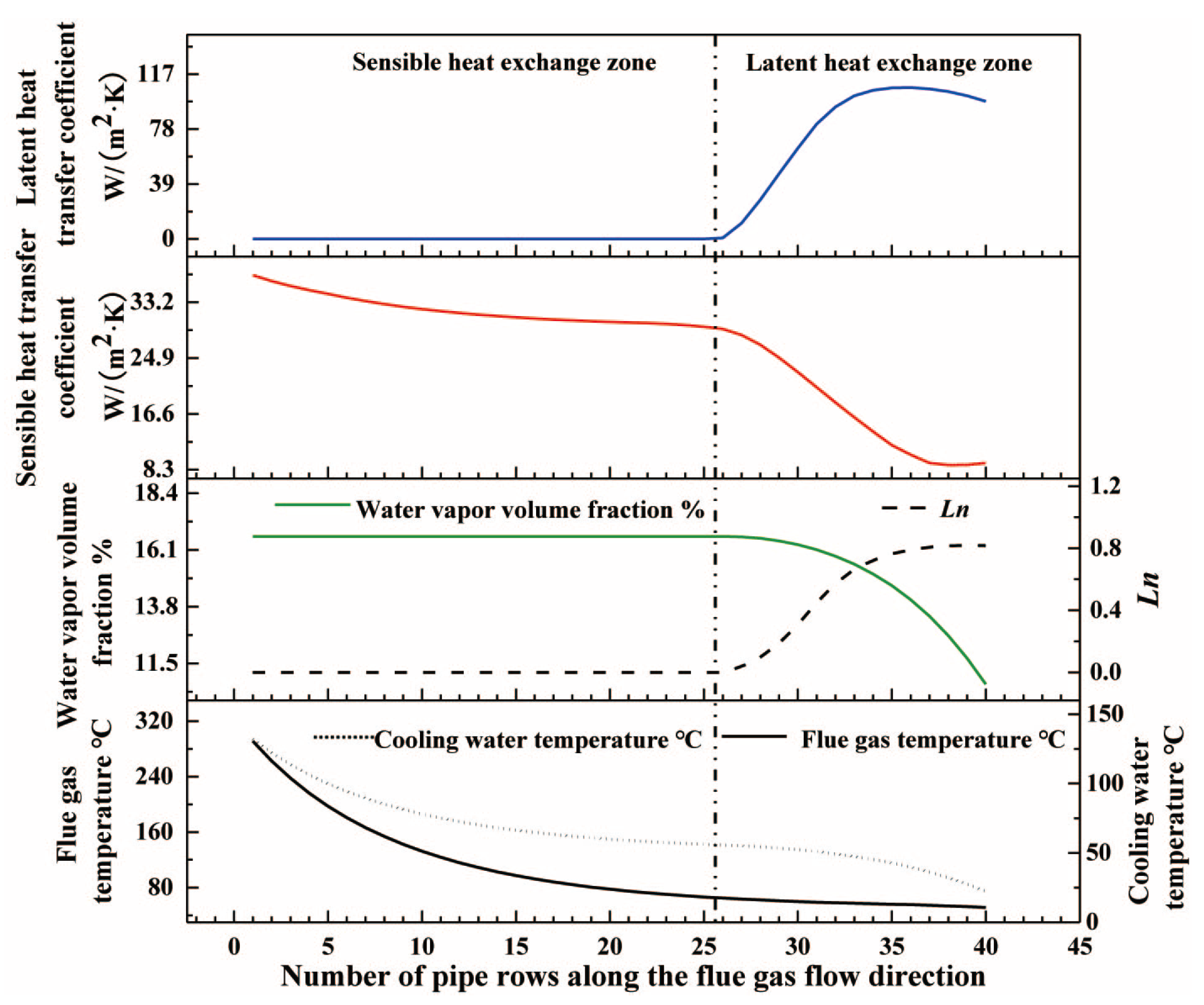 Sensible heat strengthening coefficient Dx and latent heat strengthening coefficient Dq were summarized, which were applied to calculate the sensible heat transfer coefficient and latent heat transfer coefficient under condensing conditions on the basis of the traditional sensible heat transfer correlation formula. The condensation heat transfer section was divided into multiple microelements, and the side convective heat transfer coefficient (sum of sensible heat transfer coefficient and latent heat transfer coefficient) of the previous microelement unit was used as the next microelement unit to calculate the side convective heat transfer coefficient of the wall temperature. The condensation that occurs in the calculation unit was determined, and the flue gas physical property parameters of the outlet to the next microelement unit were passed. If condensation occurs, the condensation amount of water vapor in the microelement is calculated so as to accurately obtain the flue gas flow rate, flue gas enthalpy value, and other parameters of the next microelement unit. The flue gas parameters, cooling working fluid parameters, and heat transfer coefficient of the microelement were transferred to the next microelement unit, and the cycle continued.
