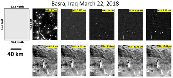 Natural gas flares in the Basra region of Iraq. Flares are readily detected in the NIR (M7 and M8) and SWIR (M10 and M11) spectral ranges. At longer wavelengths (M12–16), flare radiance is mixed with radiant emissions from the Earth’s surface and clouds. Flares gradually become dim as wavelengths increase from MWIR to LWIR.