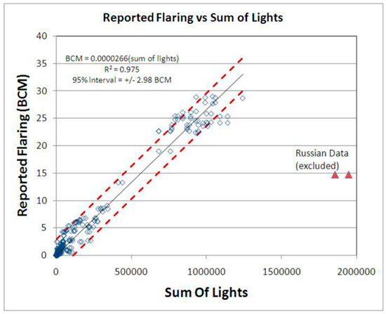 Each year, EOG identifies approximately 10,000 upstream flares worldwide. Satellite remote sensing is the only viable avenue for global flare monitoring due to the large number of flares, their wide spatial distribution, remote locations, lack of reliable measurement and reporting by operators, and the temporal variability of individual flares. The first reports of satellite detection of natural gas flares from space came from the U.S. Air Force’s Defense Meteorological Satellite Program (DMSP) low-light imaging data collected at night in the mid-1970s [16]. The DMSP cloud imaging sensor is the Operational Linescan System (OLS), which collects data in two spectral bands: panchromatic (0.5 to 0.9 μm) and longwave infrared (LWIR 11–12 μm). A photomultiplier tube (PMT) is used to intensify the panchromatic band at night, enabling the detection of moonlit clouds, a requirement for meteorologists. In addition to moonlit clouds, the nighttime DMSP visible band imagery detects lighting present at the Earth’s surface. DMSP data have been used to map nighttime lights with an annual time series extending from 1992 to 2020 [17]. Gas flares are mixed in with the city lights but can be distinguished by their large halos of scattered light and their tendency to remain active for only a limited number of years. EOG developed a calibration for estimating flared gas volumes by summing the DMSP brightness values for flaring sites, including the glow surrounding them (Figure 2). The reference data was reported for flared gas volumes compiled by the World Bank. The calibration was used to derive the first multi-year assessment of global gas flaring, spanning 1992–2006, with a paper published in 2009 [18].