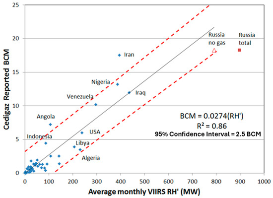 In 2012, DMSP was supplanted by VIIRS as the premier sensor for global monitoring of gas flaring. As with DMSP, VIIRS collects global imagery with a 3000 km swath width and fourteen orbits per day. The VIIRS provides significant advantages over DMSP for flare monitoring. VIIRS has many more spectral bands than the DMSP-OLS and has the advantage of in-flight calibration outside the longwave infrared (LWIR). The major advantage VIIRS has over most other sensors is the nighttime collection of near-infrared (NIR) and shortwave infrared (SWIR) spectral bands. This includes spectral bands designated as M7 and M8 (NIR) and M10 and M11 (SWIR). These spectral bands are designed for daytime imaging of the Earth based on reflected sunlight. At night, these spectral bands record the noise floor of the sensor, punctuated by bright radiant emissions from hot objects present on the Earth’s surface (Figure 1). These spectral bands are also present on many Earth observation sensors (e.g., Landsat, MODIS, Planet, etc.), but are rarely collected at night. The nighttime SWIR bands are significant as they cover the peak radiant emissions from flares. Using nighttime VIIRS data, flares can be detected in up to seven spectral bands (M7, M8, M10, M11, M12, M13, and M14) spanning a range of nine micrometers. This data product is referred to as VIIRS Nightfire [19]. With sunlight eliminated, dual Planck curve fitting is performed for a hot emitter (the flare) and a low-temperature (ambient) background. Temperature is calculated using Wein’s Displacement Law [20]. The source area is calculated with Planck’s Law [21]. These two variables are input to the Stefan–Boltzmann Law [22,23] to calculate radiant heat in megawatts (MW). This is substantially more information on the flare than DMSP. The calculation of average annual radiant heat (RH) is based solely on local maxima of VNF detection pixels deemed cloud-free. Data gaps from solar contamination and cloud cover are compensated for by assuming that the flare activity levels are unchanged during the observational gaps. The initial Cedigaz-based VIIRS flared gas volume calibration was built by pairing the annual average radiant heat with the reported annual flared (assuming all flares have the same combustion efficiency) plus vented gas volumes for upstream flaring of individual countries from Cedigaz [1]. To address the mismatch between three-dimensional flare volumes and the flat two-dimensional source areas calculated from Planck’s Law, it was decided to introduce a fractional (less than 1) exponent to the VNF source area before calculation of radiant heat with the Stefan–Boltzmann Law. The exponent-modified version of RH is referred to as RH prime (RH’). The exponent value is tuned to 0.7 to obtain the highest regression coefficient (Figure 3). This choice is best to be viewed as an empirical variance-stabilizing transform to compress the dynamic range of large events; it was not derived from a specific physical law governing flare radiant output. With the exponent, the annual BCM for the largest flares is constrained. The Cedigaz calibration, shown in Figure 4, has wide confidence intervals due to the inclusion of low-quality reporting by multiple countries.