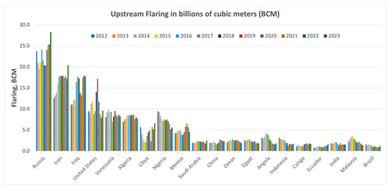 Example of the application of the Cedigaz calibration in the estimation of annual flared gas volumes in the top twenty flaring countries from 2012 to 2023.