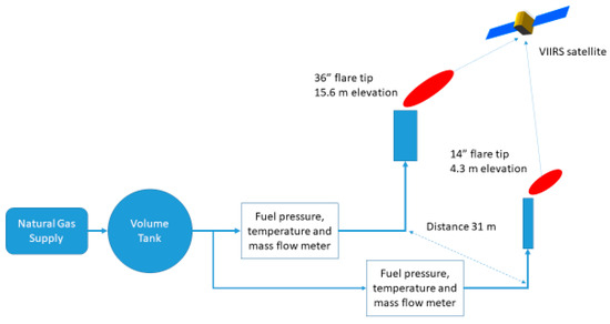 Between January 2018 and August 2019, we collected ground and satellite data from 36 test flares across three separate collection events. The flares were fired outdoors at the John Zink LLC test facility in Tulsa, Oklahoma, located at coordinates 36.1873° N, 95.8434° W. All the tests were conducted at nighttime with the same burners and the same composition of natural gas (93% methane, 5% ethane) in similar weather conditions, characterized by clear skies and low wind. The flares were lit one minute before the satellite was observed over the overpass with the VIIRS sensor in a fully developed stage. During the experiments, we varied flare configuration (single flare or double-flare cluster), flow rate, and satellite view geometry. Multiple tests at the same flow rate were conducted to incorporate satellite view angles ranging from near nadir (satellite zenith angles < 20°), medium (20–50°), and side view (50° to 70°).