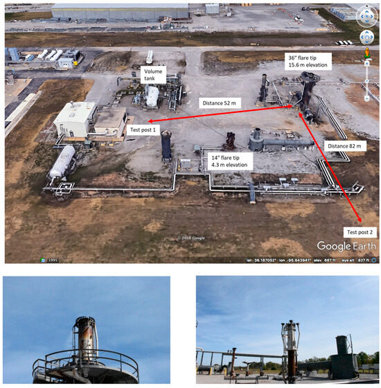 The second flare tip, utilized in the double-flare experiments, featured a smaller 14-inch inlet and was equipped with gas injection nozzles. Similar to the single-flare experiments, gas injection was not implemented, and the tip operated as a simple pipe flare. The discharge area and elevation of the second flare tip were 0.062 m2 and 4.3 m above ground, respectively. The two flare stacks were positioned 100 m apart, as illustrated in Figure 7 and Figure 8.