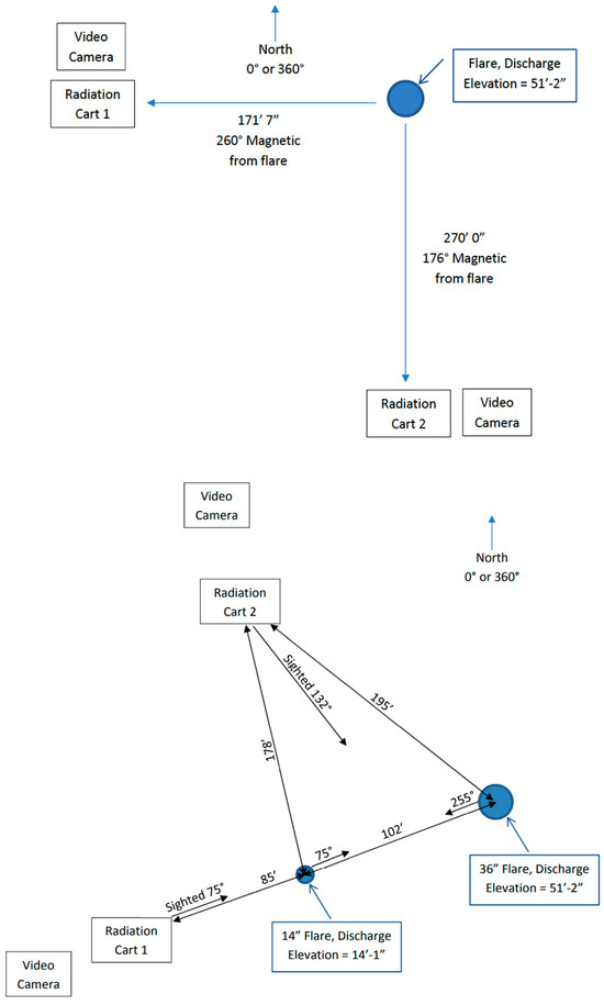 To facilitate the measurement of total radiative heat and the observation of the gas flare’s 3D shape from two distinct orientations, the test facility operator, John Zink LLC, installed two posts equipped with Sony HD video cameras and three-component full-spectrum 3% precision broadband radiometers. The post locations were adjusted throughout the experiments. The initial configuration for single-flare experiments is illustrated in Figure 9 (upper). The arrangement of the radiometric and imaging posts for dual-flare experiments is depicted in Figure 9 (lower). The output from the broadband radiometers is expressed in units of radiant heat intensity (RHI), which records a portion of the total heat output of the flare [24]. This is distinct from radiant heat (RH), which captures a flare’s total radiant output in all directions.