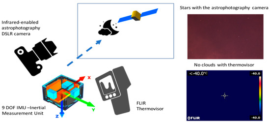 Sky conditions in the direction from the test site to the satellite were monitored using an astrophotography camera to observe stars near the satellite’s position in the sky (Figure 10). A thermal imaging camera was employed to observe patchy clouds, which exhibit temperatures higher than the background of the night sky. A digital camera, Canon EOS 750D, was modified for astrophotography by removing the IR and UV blocking “hot mirror” filter located in front of its 18-megapixel CCD sensor. This modification extended the camera’s spectral response into the VNIR region up to 1.0 µm. In conjunction with the FLIR E1 long-wave infrared thermal imaging camera, the two cameras were utilized to ensure cloud-free conditions along the view line at the time of the satellite overpass. To accurately point the cameras towards the satellite, an orientation sensor was designed and mounted on the same tripod. This orientation sensor comprises a 9 DOF MEMS inertial measurement unit, an ESP8266 microcontroller module, and an LCD display. Minutes before the test, both cameras were aimed at the satellite’s viewing coordinates (azimuth and zenith). The test proceeded only after the operator confirmed clear-sky conditions, defined by the visual detection of stars and the absence of cloud signatures in the thermal imagery. The visible and thermal images from this verification check were saved to the test log.