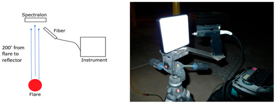 In several flare tests we have used the ASD FieldSpec spectrometer with bare fiber optic input to measure the near field spectrum of flares in visible (VNIR) and shortwave infrared (SWIR) wavelength range 0.4–2.5 μm, To avoid saturation, the fiber input was turned backwards facing at 45 deg. towards a 5″ × 5″ white Spectralon reflectance panel (Figure 11). Spectralon is a near-Lambertian reflector, and it gives a diffuse view of the flare. There were no outdoor lights or heat sources except the test flare, thus the ambient nighttime illumination has minimal impact on the resulting spectra.