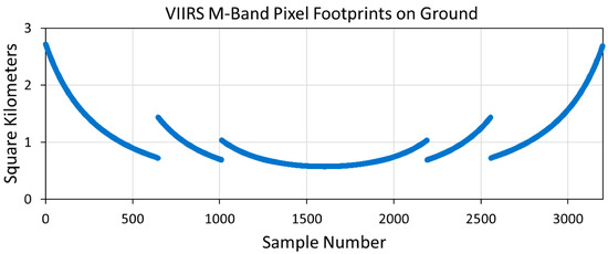 VIIRS M band pixel footprint sizes expand from nadir to edge of scan due to panoramic distortion.
