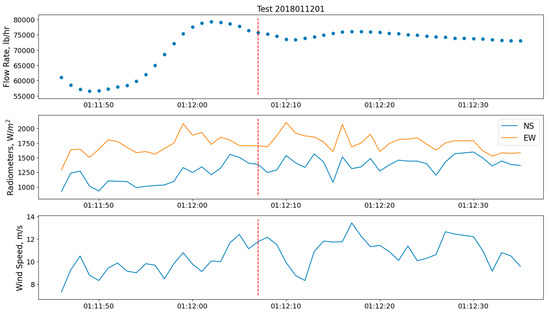 Gas flow rate, radiative heat intensities from EW and NS posts and wind speed during the large flare test 12 January 2018 07:12 UTC. Satellite overpass time is shown by a vertical dashed line.