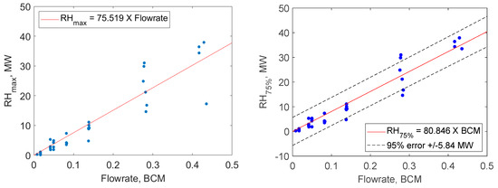 For all the RH options in Table 2, p-values for intercept b0 consistently exceed 0.05, indicating that the intercept is zero with greater than 95% significance. This observation aligns with the theoretical prediction that zero RH corresponds to zero flared gas volume. Consequently, regression through the origin (RTO) approach is appropriate for the calibration function.