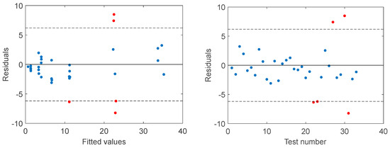 Residual and outlier plots for RTO calibration RH75% dependent on flowrate Q. The residuals are plotted vs fitted RH75% value (left) and test number (right).