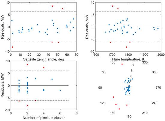 The remaining VNF outliers originate from medium and large flares in the final test set from August 2019. They are depicted in red in Figure 18. To investigate the potential cause of these outliers, we have plotted the residuals as a function of satellite zenith angle, wind direction, the number of pixels in the VNF detection cluster, and flare temperature. The satellite zenith angle affects the atmospheric transmissivity along the optical path from the satellite to the flare, as well as the visible source area. Transmissivity decreases as the zenith angle increases from nadir (0 degrees) to side view (70 degrees). The visible source area is contingent on the flare shape and orientation; however, in most cases, it will expand from a nadir to a side view. The wind direction determines the flare’s tilt and rotation. The satellite observes the flare from either the east or west due to the VIIRS scans being approximately perpendicular to the satellite’s orbit. Consequently, the visible flare surface will be larger for flares tilted along the north/south wind directions compared to east/west winds. The pixel count in the cluster of VNF detections atop the flare is dependent on the flare size and atmospheric glow. According to the Stefan–Boltzmann law, the satellite-observed flare RH is influenced by the temperature derived from the Planck curve fit to the flare spectrum in the fourth power.