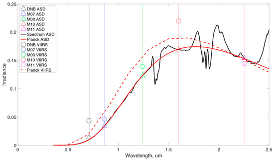 The schedule for the series of flare tests conducted at the John Zink LLC facility in Tulsa, Oklahoma, is provided in Table 1. After the first tests, the minimum flow rate was increased from 750 lb/h to 1500 lb/h due to the non-detection of a smaller flare by the satellite. Two smaller flares were detected exclusively in the VIIRS M11 spectral band. Consequently, their VIIRS spectra cannot be fitted with the Planck curves using the Nightfire algorithm and no temperature can be calculated. For tests having VNF detection in multiple spectral bands (Figure 12), the flare temperature, source area, and radiant heat are calculated using methods described by Elvidge et al. [19]. The source area calculation requires the size of the M band pixel footprints, shown in Figure 13.