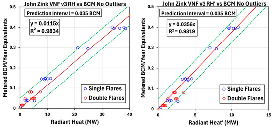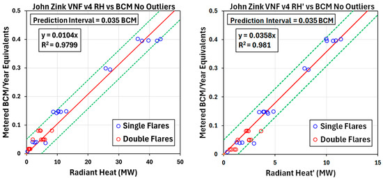 Figure 15a presents a scatterplot illustrating the relationship between normalized radiative heat intensity (RHInorm) from the East-West post and gas flow rate for all single-flare experiments. The red dots mark the VIIRS sampling times. The spread in the ground-based RHI versus flow rate is attributable to the turbulent flutter present in the flare [33] during the time it was running for the VIIRS collection. Figure 15b depicts a scatterplot of the normalized near-field heat intensity (RHInorm) against the total radiative heat (RH75%) measured by satellite. Linear regressions through the origin for both datasets yielded R2 values of 0.97 and 0.92, respectively, confirming strong linear correlations between near-field flare radiance and both metered gas flow rate and total flare radiative heat as measured by satellite.