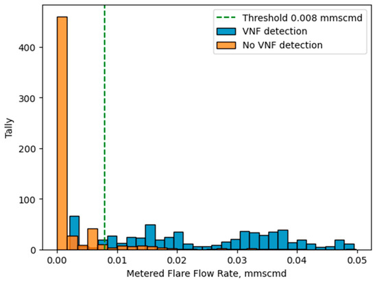 High-temporal-resolution metered upstream flare records from four sites to analyze VNF flared gas volume detection limits and to intercompare the calibration options. These records were contributed by members of the Oil and Gas Climate Initiative (OGCI). Three sites are located offshore, with one in the North Sea and two in the Gulf of Mexico. The fourth site is onshore, located on the Arabian Peninsula. The names and precise locations are not disclosed here, in keeping with the non-disclosure agreements with the data contributors. The instantaneous metered flared gas volumes are converted to daily levels in terms of million metric standard cubic meters per day (mmscmd), assuming the flare level stays constant during the day. The mmscmd flared gas volumes were matched to VNF estimates made during satellite overpasses to compile matched sets for both VNF detections and VNF non-detections. These paired sets are used in two ways: (1) to estimate the VNF detection limits for flared gas in terms of mmscmd, and (2) to assess the conformity of the field data with the ‘new’ calibration.
