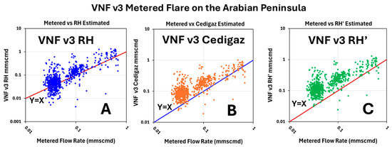 Intercomparison of the calibration options reveals the unintended consequence of the exponent. Including the exponent, reduced flared gas volumes are calculated for large flares, whereas conversely, they increase the flared gas volumes calculated for smaller flares. This effect is observed in five locations within our study. First, in the Arabian Peninsula metered gas flare (Figure 23), second in the Gulf of Mexico (Figure 24), third in the whole day analysis (Figure 28), and finally in the global annual flared gas volume estimates. As per Zipf’s Law [36], there are many more small flares than large flares. Thus, the overestimation of flared gas volumes for small flares propagates into annual global flared gas volume estimates and country-level estimates of flared gas volumes. Based on these findings, in the current year (2025), EOG will calculate flared gas volumes using the RH-based calibrations from VNF v3 and v4, as well as the Cedigaz calibration from VNF v3. We plan to transition to the John Zink calibration entirely in 2026.