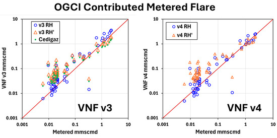 M.Z. collected the John Zink data, compared field spectra with VNF heat outputs, demonstrated the fluttering nature of flares, applied atmospheric correction, and was the lead author of Section 3 and Section 4, Methods, and Results. M.Z. was the first author to recognize the RH’s overestimation of flared gas volumes for small flares. C.D.E. conceptualized the John Zink flare tests, participated in the data analysis, and wrote the manuscript. T.S. organized and analyzed the data contributed by OGCI. T.G. helped with data analysis, manuscript review, and editing. M.B. provided manuscript review and editing. F.-C.H. helped with satellite overpass prediction and data visualization. All authors have read and agreed to the published version of the manuscript.
