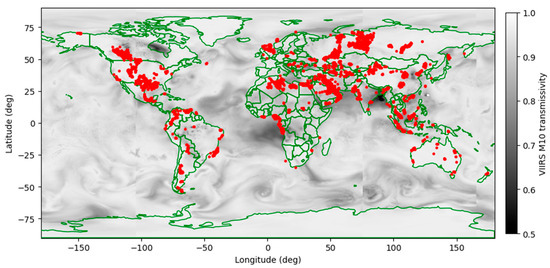 We selected 1 September 2023 for the examination of the flared gas volume calibrations and the effects of atmospheric correction on a full day of global VNF data. The VNF v3 and v4 detections were cross matched and then filtered to only include upstream flares to facilitate the examination. VNF v4 calculates the atmospheric transmissivity in all the VIIRS moderate resolution bands collected at night (M7, 8, 10, 11, 12, 13, 14, 15, and 16) and adjusts radiances to account for atmospheric variations [27]. There are 964 detections of upstream flares used for the intercomparison of the calibration options. Additionally, a global half-degree grid of M10 atmospheric transmissivity was generated and used to examine the range of transmissivities for upstream flares worldwide.