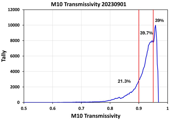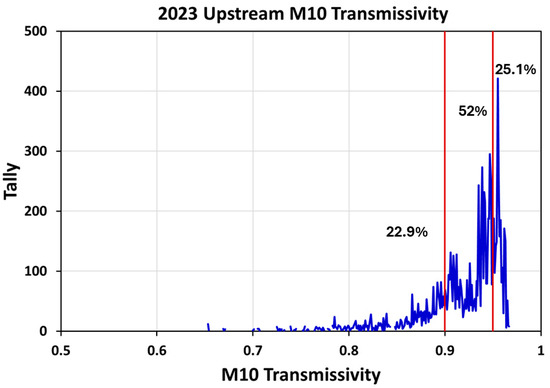 The M10 transmissivity histogram for upstream flares is shown in Figure 18. Approximately 66% of upstream flares have better than 90% atmospheric transmissivity in the M10 spectral band. The range from 80% to 90% atmospheric transmissivity covers 27.6% of the upstream flares. That leaves 6.4% of upstream flares having less than 80% atmospheric transmissivity.