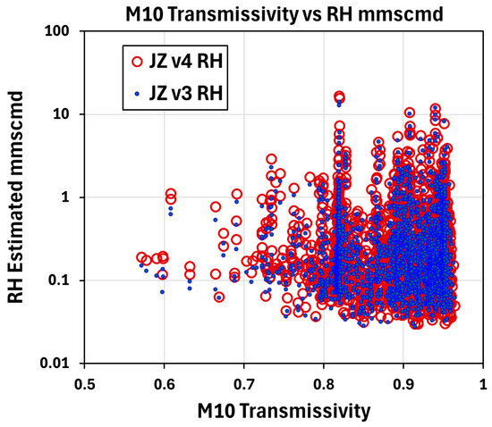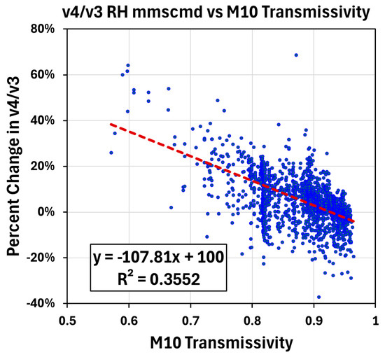 The John Zink test flare facility is situated in a mid-continent location with native grasslands, presenting a limited set of atmospheric conditions. VNF v4 includes an atmospheric correction that adjusts radiances upward based on band-specific transmissivities calculated using MODTRAN. Atmospheric transmissivities vary between the VIIRS spectral bands and also temporally. Figure 29 shows the effect of M10 atmospheric transmissivity on estimates of flared gas volumes from the VNF v3 RH versus VNF v4 RH calibration for 2278 upstream flare pixels from 1 September 2023. At high transmissivity levels, v3 and v4 flared gas volume estimates are pretty similar. However, the two diverge as transmissivity drops. The increase in VNF v4 mmscmd estimates tracks the decrease in M10 transmissivity (Figure 30).
