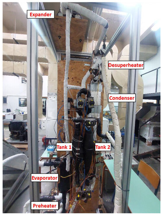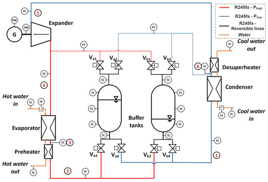 The P&ID of the experimental test rig of the E2ReLab of the NKUA [32], where the performance of investigated prototype pumpless PRC configuration has been experimentally evaluated, is presented in Figure A1.