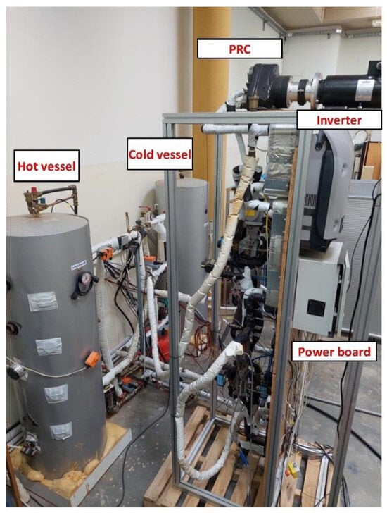 The investigated prototype pumpless PRC configuration has been experimentally evaluated in the test rig of the E2ReLab of the NKUA [32]. The experimental setup is depicted in Figure 7, while the P&ID of the experimental configuration is presented in Figure A1 of Appendix A. The test rig is composed of two 300lt water buffer vessels. The hot buffer vessel is heated by three 12 kWe electric heaters and can operate at a maximum temperature of 95 °C. The cold buffer tank is chilled by a secondary heat transfer fluid passing through the buffer tank in a spiral tube heat exchanger and is chilled by a 12 kWth water chiller. The cold buffer vessel can maintain water temperature as low as 5 °C. The two buffer vessels are used to supply the device under tests with hot and cold water with adjustable temperature and volume flow. The controller of the test setup is composed of a computer running LabVIEW software (Laboratory Virtual Instrument Engineering Workbench), Release: 2024 Q3, and the I/O signals are transmitted to the monitoring and control computer. The control program is developed to maintain the water at the inlet ports of the device under testing (PRC) at a constant temperature set by the user for the different testing scenarios by regulating the three-way valves installed at the adjacent circuits. The flow in the two circuits is regulated by adjusting the speed of the pumps through PWM signals generated by the controller. The data acquisition part of the controller is responsible for the collection of temperature and water flow measurements for the test setup, as well as temperature and refrigerant pressures for the device under testing. The sensor placement for the entire data acquisition system is presented in Table 1.
