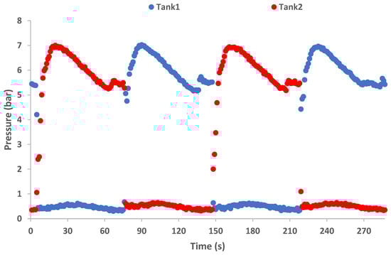 In the preliminary analysis results, the experimental data for thwin = 90 °C and tcwin = 10 °C as heat source and heat sink temperature levels are selected, respectively, and the presented results are summarized in two consecutive thermal cycles. Each thermal cycle consists of two working cycles in a row. The pressure fluctuation on each buffer tank is depicted in Figure 8. In the graph it is shown that the pressure range in the two buffer tanks depicts the same variation pattern. For the first half of each thermal cycle, Tank 2 has the role of the “hot” buffer tank, being in the high-pressure circuit, while at the same time, Tank 1 is on the low-pressure side as the “cold” buffer tank. In the second half of the thermal cycle, i.e., after the end of the previous working cycle, the two buffer tanks exchange roles, and this moment coincides with the switching of the valve system. In the same manner, the end of the second working cycle means the end of the current thermal cycle, which is followed by the beginning of a new thermal cycle. The high pressure shows a sharp rise in the beginning of each working cycle due to the existence of the passive compression phenomenon in this period of the cycle. After the high pressure reaches its maximum point, it stays stable for a few seconds, and then it follows a gradual decrease until the end of the working cycle. The beginning of the decrease in high pressure coincides with the complete evaporation of the refrigerant liquid in the high-pressure circuit, meaning that the “hot” buffer tank empties, and the thermal compression finalizes. It is important to notice that the high pressure variation follows a relative stable pattern on every operation cycle, without sharp drops at every switching phase, maintaining values over 5 bar throughout the thermal cycle, enabling the continuous power generation of the configuration. The latter important result lies in the adopted innovative design introduced by Gao et al. [26], who proposed the maintenance of the evaporator heat exchanger constantly on the high-pressure side and the condenser heat exchanger on the low-pressure side. Previous studies included the switch of evaporator and condenser heat exchanger functions, leading to sharp decreases in the cycle high pressure after every switching phase, as was the case in the results of Yamada et al. [23]. The continuous heat source and heat sink fluxes to the evaporator and condenser heat exchangers, respectively, tackle the latter drawback of PRC configurations, while the results of the current study regarding the maintenance of the high pressure in relatively high figures, even during the switching phases, are in line with the respective results of Zhu et al. [29]. Additionally, the low pressure shows also a relatively stable pattern throughout the thermal cycle since the condensation procedure remains more or less constant during each cycle.