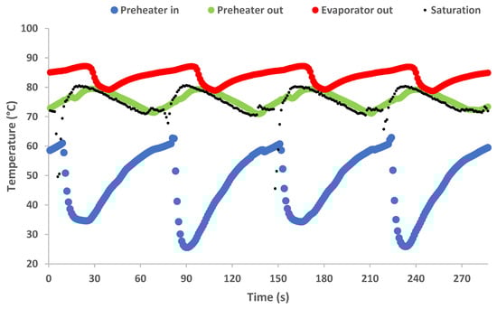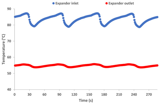 The analysis of the fluctuation of the expander inlet and outlet temperature values in combination with the change in the corresponding pressure levels is of the utmost importance since using those values allows for evaluation of the performance of the expander, which characterizes the efficiency of the total cycle to a high degree. The temperature in the expander outlet has a negligible alteration during each cycle, as shown in the graph of Figure 9. The expander inlet temperature has a slight incremental increase at the beginning of each working cycle, which is justified by the rise in the high pressure in the same period. However, a sharp decrease follows, which corresponds to the end of the evaporation procedure. This means that the expander inlet temperature approaches or is even equal for a few seconds with the saturation temperature in the evaporator heat exchanger. The latter is confirmed by the variation of the evaporator outlet temperature given in Figure 10. After the end of the evaporation, the heat transfer includes only direct heat transfer between the secondary heat source fluid and the vapor refrigerant in both the preheater and the evaporator heat exchangers, which is confirmed by a gradual increase in its temperature until the end of the cycle.