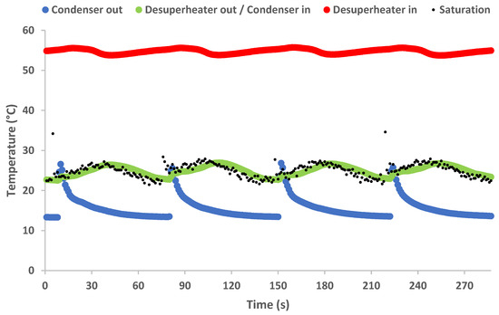 The saturation temperature in the high-pressure side is completely defined by the high-pressure variation, and it is depicted in the graph of Figure 10. Values close to the saturation temperature are given in the same plot for the outlet of the preheater, as expected, since the liquid refrigerant is heated up to the saturation point in this heat exchanger. The preheater inlet temperature corresponds to the refrigerant temperature in the main liquid line, which drops down close to the condensation temperature at the beginning of each cycle due to the switching of the two buffer tanks. When the “hot” buffer tank empties, the vapor refrigerant temperature in the preheater inlet begins to rise as it follows the heating of the vapor in the rest of the high-pressure circuit. In Figure 11 the variation of the temperature levels before and after the desuperheater and the condenser heat exchangers modules are given. The desuperheater inlet temperature remains almost stable throughout every cycle, corresponding to the expander outlet temperature. The desuperheater outlet temperature fluctuates close to the pattern of the saturation temperature corresponding to the variation of the low-pressure circuit, which is equal to the condensing pressure of the refrigerant. More precisely, it can be seen that for about the first half of each working cycle, the preheater outlet is higher than the saturation temperature, while during the second half, it drops below it. This means that on the one hand, in the first case, the desuperheater operates as a “condenser”, i.e., the condensation takes place in this heat exchanger. On the other hand, in the second case, the preheater module operates as a “desuperheater”, meaning that it only cools the refrigerant vapor close to the saturation point. The condenser outlet temperature in the same graph shows a sharp incremental increase during the first seconds after the beginning of each cycle due to the buffer tanks switching, when the condenser fully empties the liquid refrigerant, and its outlet instantly contains vapor refrigerant. After a few seconds liquid refrigerant fills again to the line at the condenser outlet, and the corresponding temperature drops back to a level below the saturation temperature due to the excessive subcooling degree.