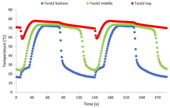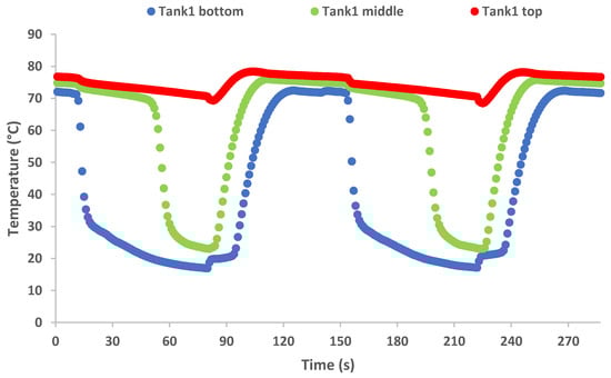 For a better understanding of the pumpless cycle operation, the temperature plots including the different height points of the two buffer tanks given in Figure 12 and Figure 13 can be used. Refrigerant temperature can be directly linked to the liquid level if this is over or below the temperature probe installation height point. As mentioned earlier, the graphs presented show two consecutive thermal cycles, or four working cycles in a row. During the first thermal cycle, Tank 1 is the “cold” buffer and Tank 2 is the “hot”, and vice versa in the second thermal cycle. As it is depicted in the graphs below, the cold buffer contains only vapor refrigerant at the beginning of each working cycle and starts to be filled with liquid refrigerant from bottom to top. By the end of each working cycle, the cold buffer has filled beyond the middle point with liquid refrigerant. Additionally, after the switch phase between each working cycle, the hot buffer tank is initially half-full with liquid refrigerant. After a few seconds of operation, the liquid level drops drastically, and the hot buffer empties as the temperature in the entire vessel rises. The two temperature patterns in the two vessels are almost equal, having a time displacement of one working cycle, as expected. The working cycle time of 70 s was selected to ensure that the cold buffer is totally empty and the liquid level in the hot buffer tank is as high as possible at the end of each cycle, as is justified by the results. On the one hand, high switching frequencies lead to increased transitional periods and more consecutive drops in power production, resulting in unstable operation. On the other hand, prolonged cycle operation stops the passive compression phenomenon as soon as the entire liquid refrigerant in the main liquid line has been evaporated, resulting in negligible power generation. Additionally, the buffer tank volume seems to play an important role in the cycle operation since increased tank volume could enable higher cycle duration; however, aspects such as techno-economic and construction restrictions should be considered.