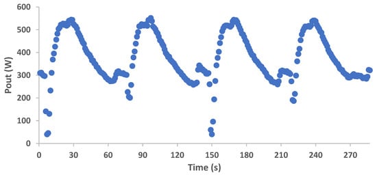 The generated output power (Pout) and the generator speed variation are presented in the plots of Figure 14 and Figure 15, respectively. The two figures are as expected: directly proportional to each other, plus both of them follow the variation of the high pressure, i.e., the pressure ratio in the expander module, since the low pressure is more or less stable. It is important to highlight the fact that the output power, for the selected 90–10 °C thwin-tcwin pair, ranges between 300 and 550 W, having drops in its value below 300 W only for a few seconds during the switching phase between each working cycle. Additionally, the generator speed fluctuates between 2000 and 2800 rpm, while it hardly drops below this range. The latter confirms that the examined configuration shows relatively stable operation, with continuous power generation despite the switching phase, which inherently disrupts the constant refrigerant flow throughout the cycle. PRC performance enhancement could be obtained by optimizing its design, focusing on architectures providing continuous liquid refrigerant flow in the evaporator heat exchanger, e.g., with increased buffer tank volume, to prolong the continuous power generation of the configuration.