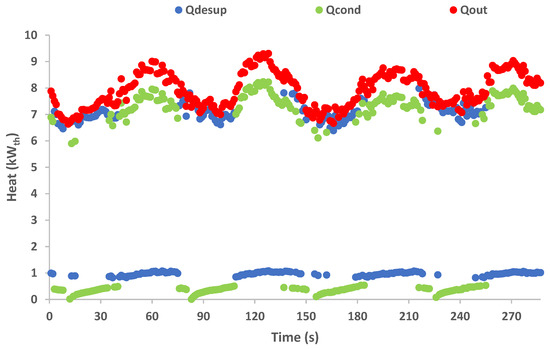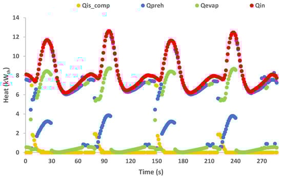 The current section includes the calculation results of the thermal fluxes of the different individual parts of Qin and Qout as they are presented in the graphs of Figure 16 and Figure 17, respectively. As the plots present two thermal cycles, Qin shows a sharp augmentation during the first half of each cycle due to the intense evaporation process taking place during this phase of the cycle. The latter is confirmed by the high portion of the Qevap at the same period, while the Qpreh follows the same pattern with lower values. It is notable that at the beginning of each cycle, or after the switching phase, Qiscomp instantly increased to its maximum point, followed by a sharp decrease, while it dropped to a zero value after a few seconds. The latter is based on the isochoric compression phenomenon, which takes place during the beginning of each cycle, accompanied by the sharp increment of the high pressure in the same period as analyzed in the previous section. As soon as the high pressure starts to decrease, the phenomenon is finished, and normally, Qiscomp has zero values. Qout is almost equal to the Qdesup for the first half of each cycle since, during this period, the condensing process takes place entirely in the desuperheater heat exchanger, and the condenser module has a negligible cooling effect. However, during the second half of each working cycle, the increased condensing load cannot be handled by the desuperheater module. During this phase the desuperheater cools the refrigerant vapor close to the saturation point, as discussed earlier, and the condensation takes place in the main condenser, which has the main portion of the heat rejected to the ambient air. The reason that the peaks of Qin and Qout do not coincide is based on the thermal inertia of the configuration, which can split the investigated system operation into the charging and the discharging phases. During the charging phase the system absorbs high amounts of heat by the heat source due to the evaporation process during the first half of each cycle, while during the second half of each cycle, the produced refrigerant vapor accumulated in the low-pressure circuit leads to the increased condensing load.