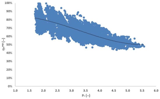 Expander isentropic efficiency in correlation to the pressure ratio.