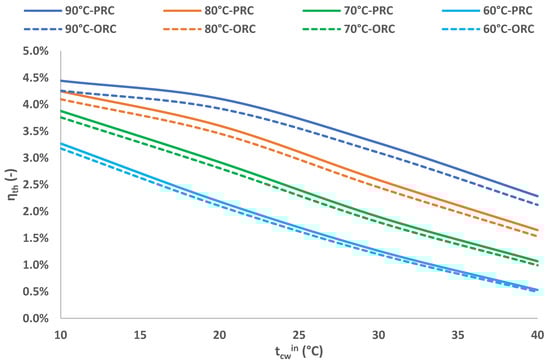 - For all the examined cases, the PRC system results in higher efficiency figures compared to the conventional ORC solution. The deviation between the two cases shows increased values along with the increment of both tcwin and thwin. More precisely, for the case of tcwin = 40 °C and thwin = 90 °C, the ηth and the ηex calculated for the PRC are 7.7% and 7.5% higher, respectively, than the case of the ORC.