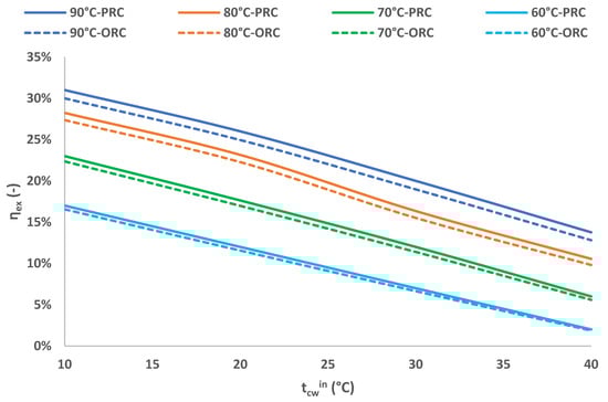 Exergy efficiency (ηex) comparison between PRC and conventional ORC for different conditions.