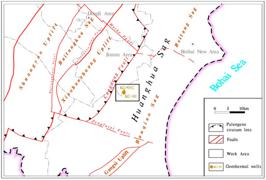 The Huanghua Depression is located in the Bohai Bay basin of North China and is geographically situated in the eastern part of Hebei Province and the southern part of Tianjin City. The region boasts a complex geological structure primarily formed by sedimentation since the Neogene period. It is rich in geothermal resources predominantly consisting of sandstones from the Minghuazhen Formation and Guantao Formation of the Neogene system. These resources are characterized by shallow burial depth, widespread distribution, large reserves, high porosity, and low permeability. The thermal reservoirs in the Guantao Formation are buried at a depth of approximately 1600–2000 m, with water temperatures ranging from 48 to 82 °C. The geothermal gradient within the Huanghua Depression varies significantly, generally ranging from 3.27 to 3.57 °C/100 m, indicating strong geothermal activity [28,29,30].
