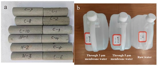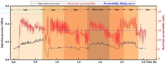 Under constant temperature (25 °C) and advantageous flow rate conditions, the injection fluid was pretreated using filter membranes of varying pore sizes (1 μm, 3 μm, and 5 μm), with untreated raw water (>5 μm) used as a control.